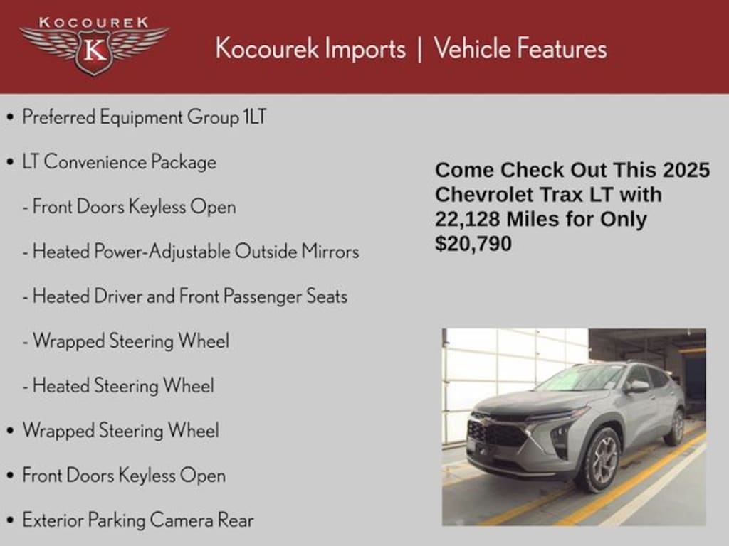 Trax LT, 4D Sport Utility, 1.2L I3 DI Turbocharged DOHC 12V LEV3-ULEV70 137hp, 6-Speed Automatic, FWD, Sterling Gray Metallic, Jet Black With Blue Accents Cloth, Exterior Parking Camera Rear, Front Doors Keyless Open, Fully automatic headlights, Heated Driver and Front Passenger Seats, Heated Power-Adjustable Outside Mirrors, Heated Steering Wheel, LT Convenience Package, Preferred Equipment Group 1LT, Wrapped Steering Wheel, 2-Way Adjustable Front Head Restraints, 3.50 Final Drive Axle Ratio, 4-Way Manual Front Passenger Seat Adjuster, 4-Wheel Disc Brakes, 6 Speakers, 6-Speaker Audio System Feature, 6-Way Manual Driver Seat Adjuster, ABS brakes, Air Conditioning, Alloy wheels, AM/FM radio: SiriusXM, Auto High-beam Headlights, Automatic temperature control, Brake assist, Bumpers: body-color, Cloth/Evotex Seat Trim, Compass, Delay-off headlights, Driver door bin, Driver vanity mirror, Dual front impact airbags, Dual front side impact airbags, Electronic Stability Control, Emergency communication system: OnStar One Essentials, Front anti-roll bar, Front Bucket Seats, Front Center Armrest, Front reading lights, Front wheel independent suspension, Illuminated entry, License Plate Front Mounting Package, Low tire pressure warning, Occupant sensing airbag, Outside temperature display, Overhead airbag, Overhead console, Panic alarm, Passenger door bin, Passenger vanity mirror, Power door mirrors, Power steering, Power windows, Premium audio system: Chevrolet Infotainment 3, Radio data system, Radio: AM/FM Stereo Audio System, Rear window defroster, Rear window wiper, Remote keyless entry, Security system, SiriusXM Trial Subscription, Speed control, Split folding rear seat, Spoiler, Steering wheel mounted audio controls, Tachometer, Telescoping steering wheel, Tilt steering wheel, Traction control, Trip computer, Variably intermittent wipers, Wheels: 17 Inch Gray-Painted Machined Aluminum Alloy, Trax LT, 4D Sport Utility, 1.2L I3 DI Turbocharged DOHC 12V LEV3-ULEV70 137hp, 6-Speed Automatic, FWD, Sterling Gray Metallic, Jet Black With Blue Accents Cloth, Exterior Parking Camera Rear, Front Doors Keyless Open, Fully automatic headlights, Heated Driver and Front Passenger Seats, Heated Power-Adjustable Outside Mirrors, Heated Steering Wheel, LT Convenience Package, Preferred Equipment Group 1LT, Wrapped Steering Wheel.