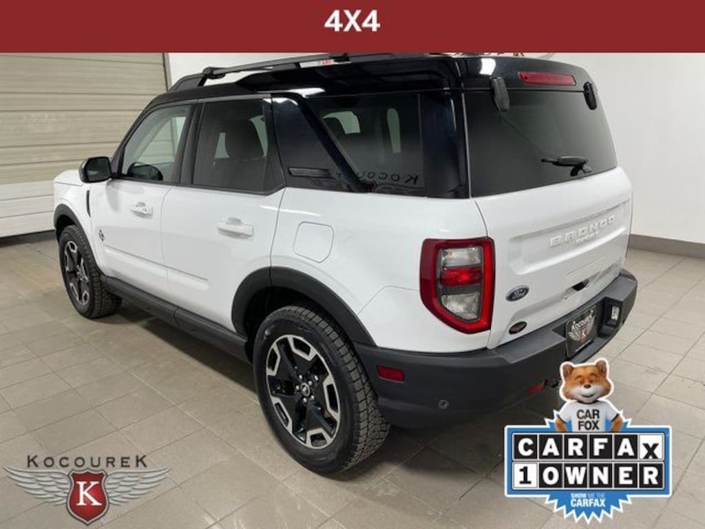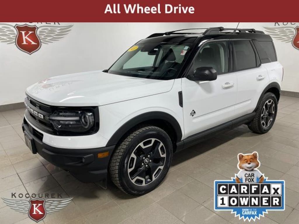 Local Trade!, Keyless Entry, All Wheel Drive, 4X4, Heated Seats, Heated Steering Wheel, Leather Seats, Apple Car Play, Bluetooth, Portable Audio Connection, Backup Camera, Multi-zone Climate Control, Bronco Sport Outer Banks, 4D Sport Utility, 1.5L EcoBoost, 8-Speed Automatic, 4WD, Oxford White, Navy Pier Leather, 3.80 Axle Ratio, 4-Wheel Disc Brakes, 6 Speakers, ABS brakes, Air Conditioning, AM/FM radio: SiriusXM, AM/FM Stereo, Automatic temperature control, Class II Trailer Tow Package w/Trailer Sway Control, Driver vanity mirror, Dual front impact airbags, Dual front side impact airbags, Emergency communication system: SYNC 3 911 Assist, Equipment Group 300A, Evasive Steering Assist, Ford Co-Pilot360 Assist+, Four wheel independent suspension, Front anti-roll bar, Front Bucket Seats, Front dual zone A/C, Front reading lights, Heated front seats, Heated steering wheel, Illuminated entry, Intelligent Adaptive Cruise Control w/Stop & Go, Knee airbag, Low tire pressure warning, Occupant sensing airbag, Outside temperature display, Overhead airbag, Overhead console, Power driver seat, Power passenger seat, Power steering, Power windows, Rain sensing wipers, Rear anti-roll bar, Rear reading lights, Rear seat center armrest, Rear window defroster, Rear window wiper, Remote keyless entry, Speed-sensing steering, Speed-Sensitive Wipers, Split folding rear seat, Steering wheel mounted audio controls, SYNC 3 Communications & Entertainment System, SYNC 3/Apple CarPlay/Android Auto, Tachometer, Tilt steering wheel, Traction control, Trip computer, Variably intermittent wipers, Voice-Activated Touchscreen Navigation System, Wheels: 18" Ebony Black-Painted Aluminum, Alloy wheels, Auto High-beam Headlights, Auto-dimming Rear-View mirror, Brake assist, Compass, Delay-off headlights, Driver door bin, Electronic Stability Control, Exterior Parking Camera Rear, Front Center Armrest, Front fog lights, Fully automatic headlights, Heated door mirrors, Leather Trimmed Heated Sport Contour Bucket Seats, Panic alarm, Passenger door bin, Passenger vanity mirror, Power door mirrors, Radio data system, Rear Parking Sensors, Roof rack: rails only, Security system, Speed control, Telescoping steering wheel, Bronco Sport Outer Banks, 4D Sport Utility, 1.5L EcoBoost, 8-Speed Automatic, 4WD, Oxford White, Navy Pier Leather, 3.80 Axle Ratio, 4-Wheel Disc Brakes, 6 Speakers, ABS brakes, Air Conditioning, AM/FM radio: SiriusXM, AM/FM Stereo, Automatic temperature control, Class II Trailer Tow Package w/Trailer Sway Control, Driver vanity mirror, Dual front impact airbags, Dual front side impact airbags, Emergency communication system: SYNC 3 911 Assist, Equipment Group 300A, Evasive Steering Assist, Ford Co-Pilot360 Assist+, Four wheel independent suspension, Front anti-roll bar, Front Bucket Seats, Front dual zone A/C, Front reading lights, Heated front seats, Heated steering wheel, Illuminated entry, Intelligent Adaptive Cruise Control w/Stop & Go, Knee airbag, Low tire pressure warning, Occupant sensing airbag, Outside temperature display, Overhead airbag, Overhead console, Power driver seat, Power passenger seat, Power steering, Power windows, Rain sensing wipers, Rear anti-roll bar, Rear reading lights, Rear seat center armrest, Rear window defroster, Rear window wiper, Remote keyless entry, Speed-sensing steering, Speed-Sensitive Wipers, Split folding rear seat, Steering wheel mounted audio controls, SYNC 3 Communications & Entertainment System, SYNC 3/Apple CarPlay/Android Auto, Tachometer, Tilt steering wheel, Traction control, Trip computer, Variably intermittent wipers, Voice-Activated Touchscreen Navigation System, Wheels: 18" Ebony Black-Painted Aluminum.
