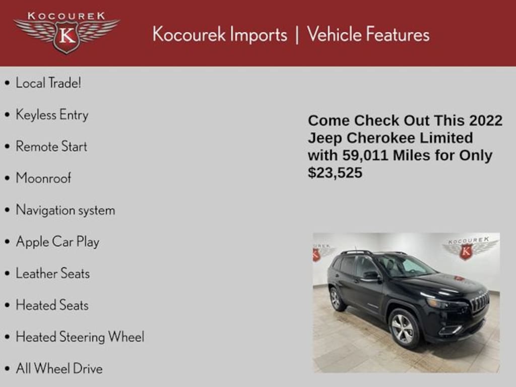 Please call one of our knowledgeable Sales Consultants with any question you might have. Serving guests in Marathon, Portage, Langlade, Oneida, Taylor, Vilias, Wood, Clark, Lincoln, Waupaca or near me! 2022 Jeep Cherokee Limited