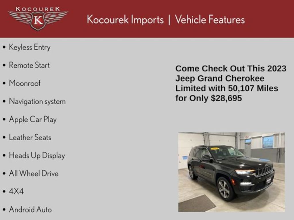 Keyless Entry, Remote Start, Moonroof, Navigation system, Apple Car Play, Leather Seats, Heads Up Display, All Wheel Drive, 4X4, Android Auto, Bluetooth, Backup Camera, Grand Cherokee Limited, 4D Sport Utility, 3.6L V6 24V VVT, 8-Speed Automatic, 4WD, Diamond Black Crystal Pearlcoat, Global Black Leather, 220 Amp Alternator, 2nd-Row Manual Window Shades, Auto-Dimming Exterior Driver Mirror, Automatic Headlamp Levelling System, Capri Leatherette w/Axis II Seats, Front/Rear Doors & Liftgate w/Passive Entry, Heavy-Duty Engine Cooling, Integrated Off-Road Camera, Intersection Collision Assist System, Luxury Tech Group II, Memory Steering Column, Navigation System, ParkSense Front/Rear Park Assist w/Stop, Power Tilt/Telescope Steering Column, Quick Order Package 22E, Rain Sensitive Windshield Wipers, Rear Back-Up Camera Washer, Rear Load Levelling Suspension, Rearview Autodim Digital Display Mirror, Surround View Camera System, Trailer Hitch Zoom, Trailer Tow Prep Group (B) (DISC), Ventilated Front Seats, Wireless Charging Pad, 3.45 Rear Axle Ratio, 4-Wheel Disc Brakes, 506 Watt Amplifier, 6 Speakers, 9 Amplified Speakers w/Subwoofer, ABS brakes, Active Noise Control System, Air Conditioning, Alloy wheels, AM/FM radio: SiriusXM with 360L, Anti-whiplash front head restraints, Audio memory, Auto High-beam Headlights, Automatic temperature control, Brake assist, Bumpers: body-color, Capri Leatherette Seats, Compass, Delay-off headlights, Driver door bin, Driver vanity mirror, Dual front impact airbags, Dual front side impact airbags, Dual-Pane Panoramic Sunroof, Electronic Stability Control, Emergency communication system, Four wheel independent suspension, Front anti-roll bar, Front Bucket Seats, Front Center Armrest w/Storage, Front dual zone A/C, Front fog lights, Front reading lights, Fully automatic headlights, Garage door transmitter, Heated door mirrors, Heated front seats, Heated rear seats, Heated steering wheel, Illuminated entry, Knee airbag, Low tire pressure warning, Memory seat, Molded In Color Black/Gloss Black Roof Rails, Normal Duty Suspension, Occupant sensing airbag, Outside temperature display, Overhead airbag, Overhead console, Panic alarm, ParkView Rear Back-Up Camera, Passenger door bin, Passenger vanity mirror, Power door mirrors, Power driver seat, Power Liftgate, Power passenger seat, Power steering, Power windows, Radio data system, Radio: Uconnect 5 Nav w/10.1" Display, Rear anti-roll bar, Rear reading lights, Rear window defroster, Rear window wiper, Remote keyless entry, Security system, Speed control, Speed-Sensitive Wipers, Split folding rear seat, Spoiler, Steering wheel mounted audio controls, Tachometer, Telescoping steering wheel, Tilt steering wheel, Traction control, Trip computer, Turn signal indicator mirrors, Variably intermittent wipers, Voltmeter, Wheels: 18" x 8" Fully Painted Aluminum, Wheels: 20" x 8.5" Machined/Painted Aluminum, Grand Cherokee Limited, 4D Sport Utility, 3.6L V6 24V VVT, 8-Speed Automatic, 4WD, Diamond Black Crystal Pearlcoat, Global Black Leather, 220 Amp Alternator, 2nd-Row Manual Window Shades, Auto-Dimming Exterior Driver Mirror, Automatic Headlamp Levelling System, Capri Leatherette w/Axis II Seats, Front/Rear Doors & Liftgate w/Passive Entry, Heavy-Duty Engine Cooling, Integrated Off-Road Camera, Intersection Collision Assist System, Luxury Tech Group II, Memory Steering Column, Navigation System, ParkSense Front/Rear Park Assist w/Stop, Power Tilt/Telescope Steering Column, Quick Order Package 22E, Rain Sensitive Windshield Wipers, Rear Back-Up Camera Washer, Rear Load Levelling Suspension, Rearview Autodim Digital Display Mirror, Surround View Camera System, Trailer Hitch Zoom, Trailer Tow Prep Group (B) (DISC), Ventilated Front Seats, Wireless Charging Pad.